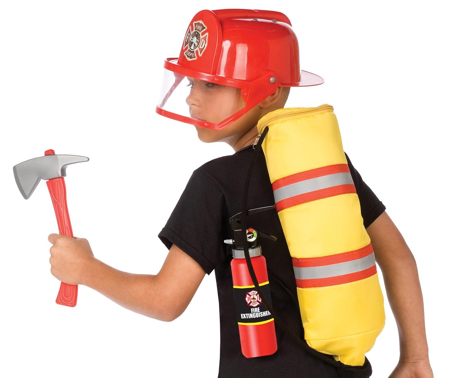 1. Fireman helmet, yellow playpack with storage, silver badge, fire extinguisher and axe, walkie talkie. Great for pretend play. Buyseasons Mens Gear to Go - Fireman Adventure Play Set